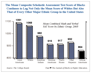 Of course the most direct evidence of this sentiment is the idea that affirmative action in education is a sufficient remedy for whatever ails black students. The notion that skin color alone is or should be the determining criterion that allows for variant (read lower) standards for admission to institutions of higher learning and employment has had a corrosive effect on the thinking and imagination of black recipients and liberal supporters of affirmative action. That such is the case is indicated by the following taken from the aforementioned JBHE article, in which the authors discuss the impact of changes in the composition of the SAT.